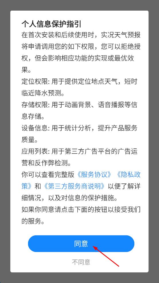 1、打开实况天气预报App,出现个人信息保护指引弹窗,阅读后点击同意按钮。