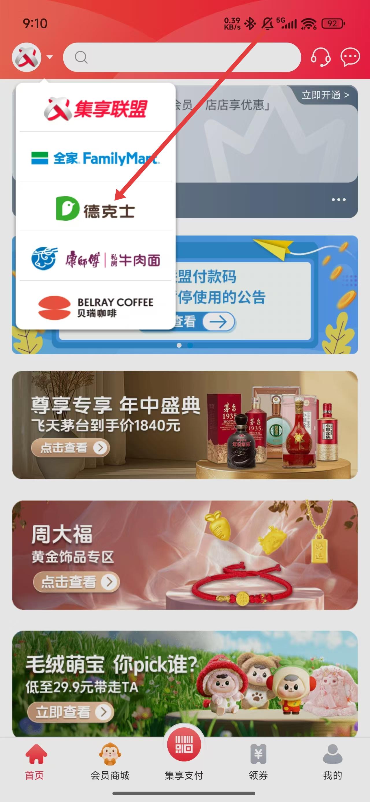 1、在集享联盟App中点击左上角图标后,选择德克士进行切换模式。