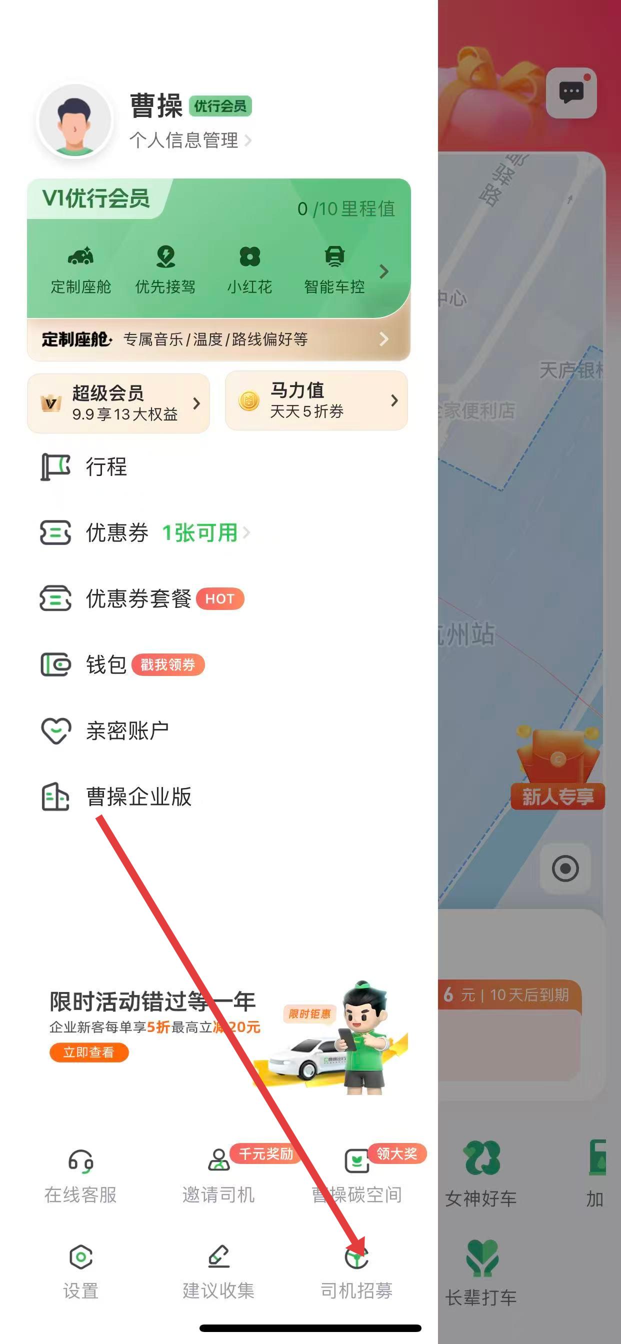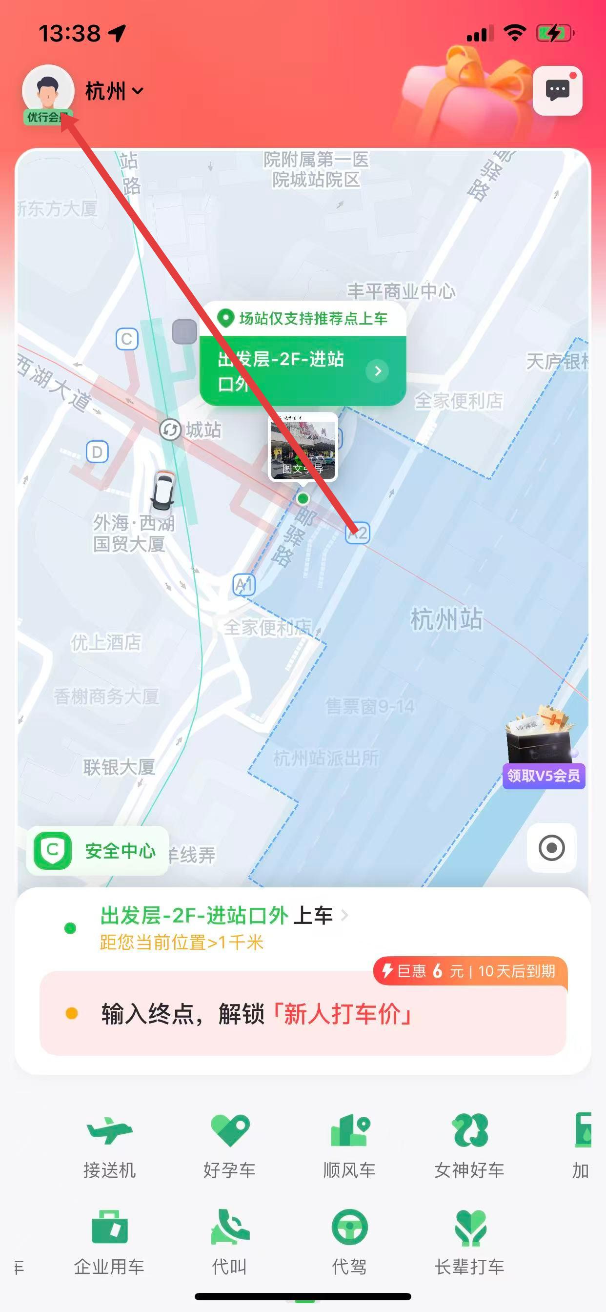 1、打开曹操出行APP,进入主界面。点击左上角头像,进入个人中心页面。