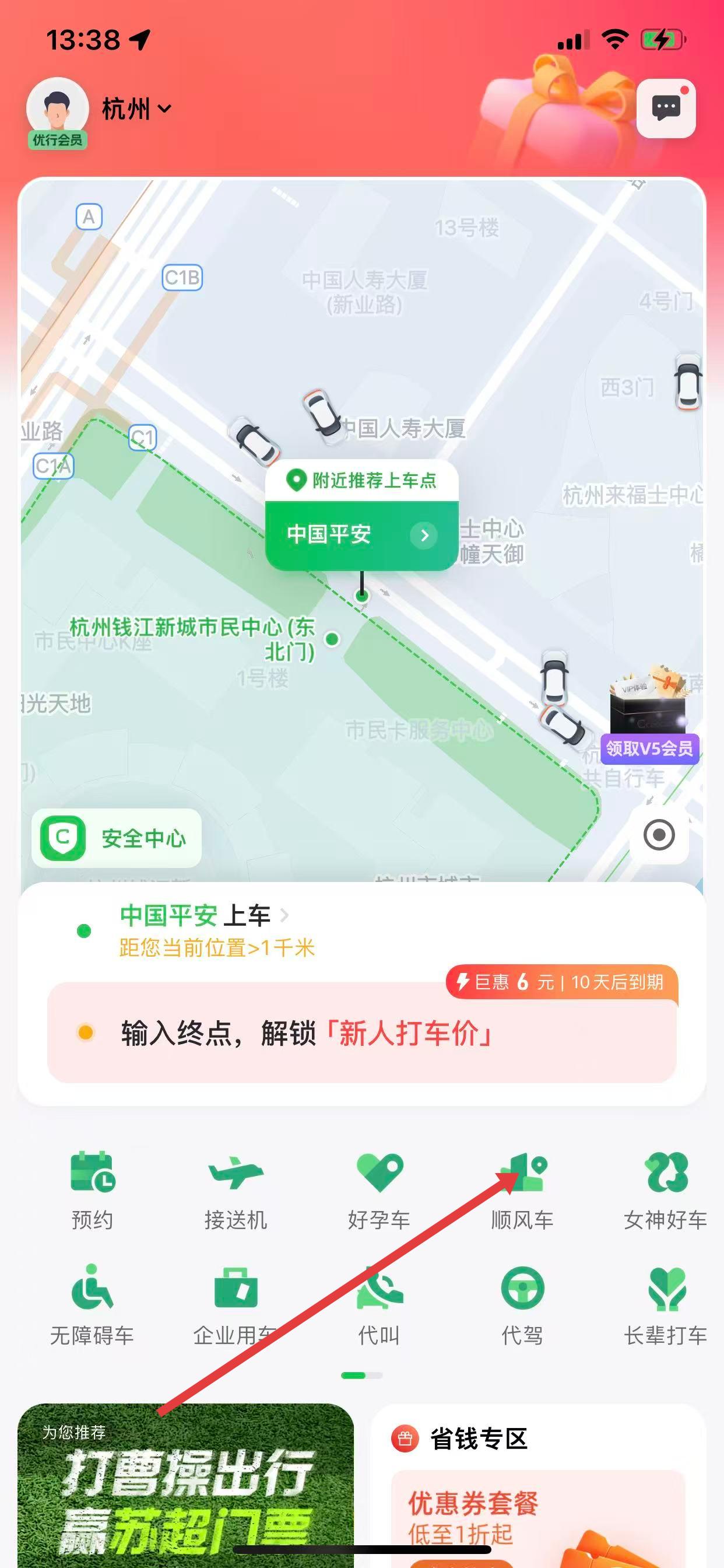 1、打开曹操出行APP,在页面中找到并点击顺风车选项。