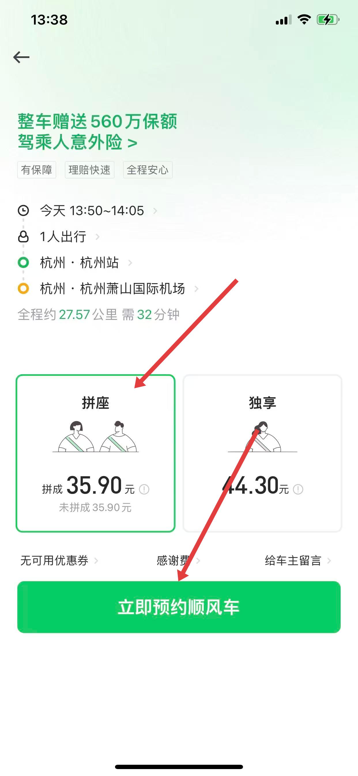 4、页面会显示拼座和独享的价格,点击立即预约顺风车。
