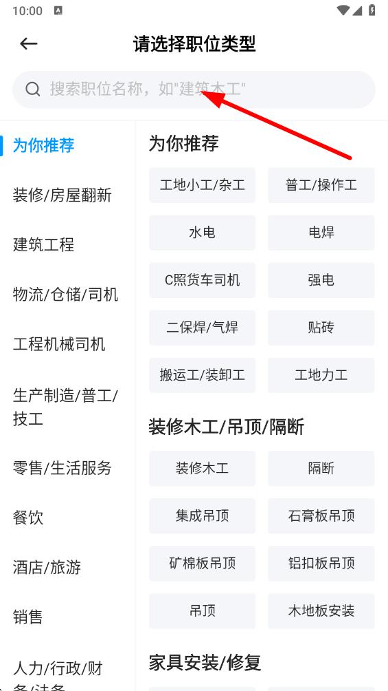 3、点击职位类型选项,在弹出页面中,可直接从推荐职位里选择,或者在搜索框输入职位名称,选定所需招聘的职位类型。
