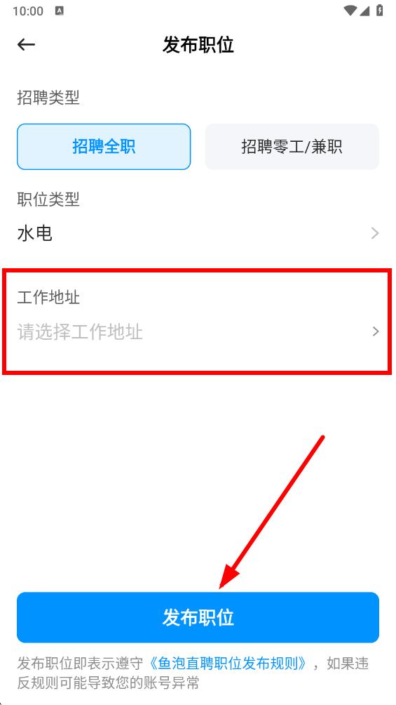 4、选择工作地址,确认无误后,点击底部的发布职位按钮,即可成功发布招聘信息。