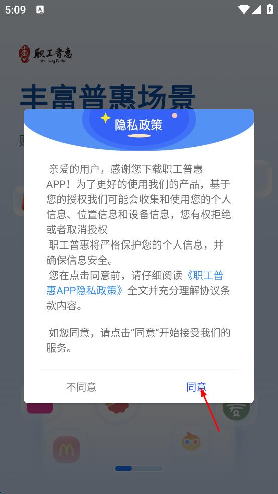 1、打开职工普惠APP,出现隐私政策界面,仔细阅读后点击“同意”,进入登录页面。
