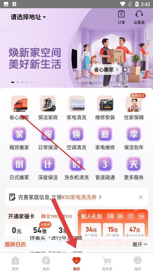 1、打开自如App,在服务页面中,找到并点击省心搬家选项。