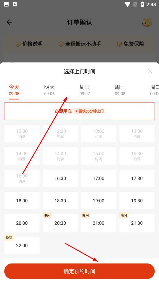 4、在订单确认页面,选择上门时间,点击确定预约时间,完成搬家预约。