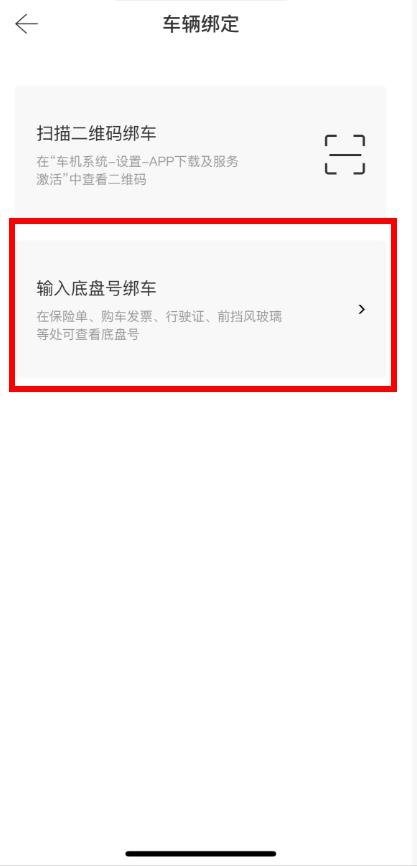 3、进入车辆绑定页面,选择输入底盘号绑车方式。