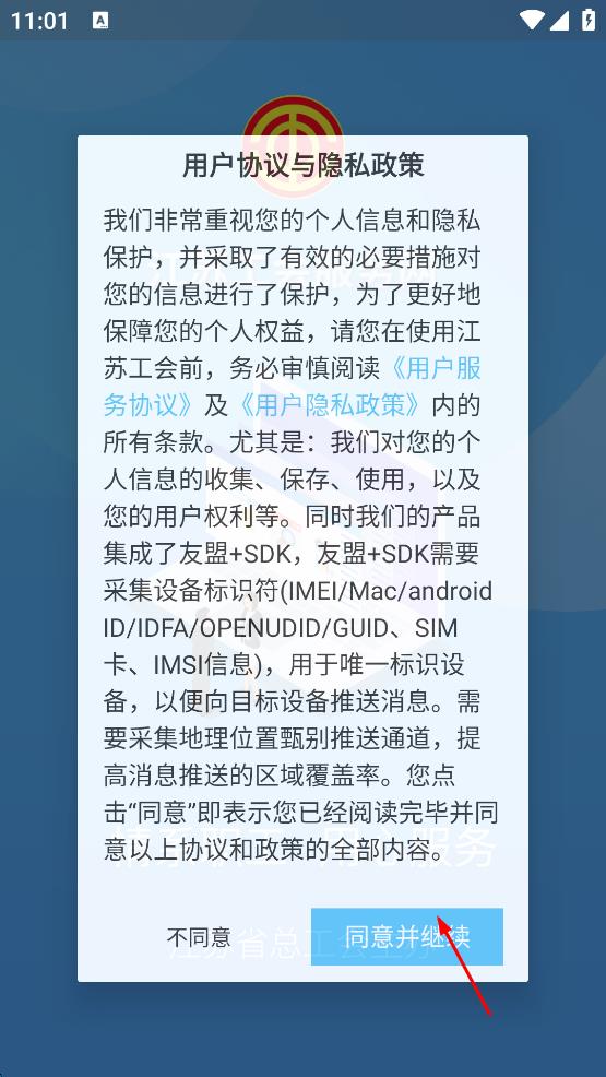 1、打开江苏工会App,出现用户协议与隐私政策弹窗,阅读后点击同意并继续按钮。