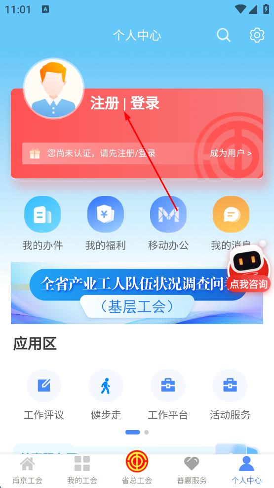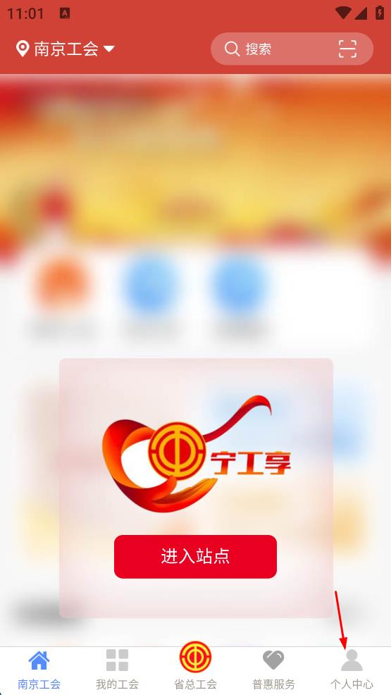 2、进入南京工会页面,点击右下角个人中心选项,进入个人中心页面。
