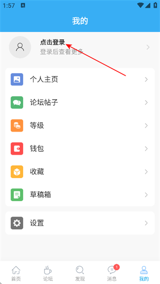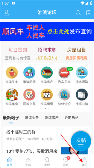 1、在淮滨论坛软件首页,点击底部我的,进入个人页面。