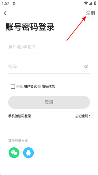 3、在账号密码登录页面,点击注册,进入注册新账号页面。