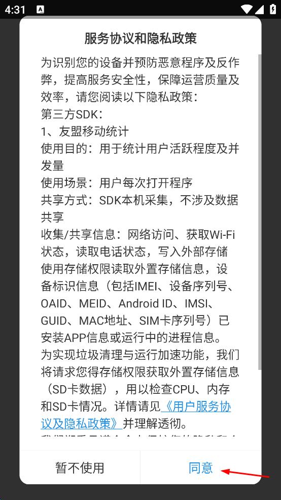 1、打开该App,出现服务协议和隐私政策弹窗,阅读后点击同意按钮。
