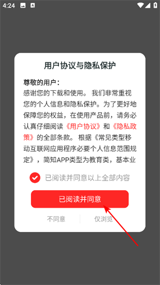 1、在用户协议弹窗中,点击已阅读并同意,进入APP。
