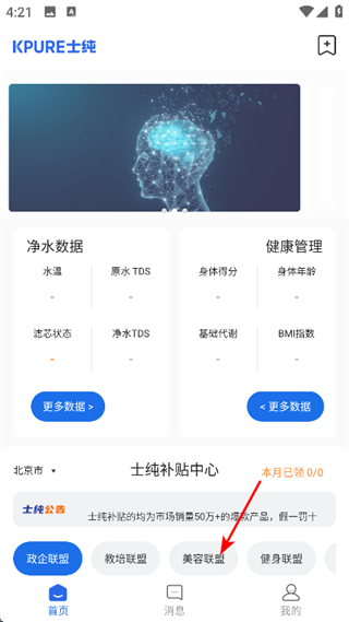 1、在APP首页,点击美容联盟,进入美容联盟相关页面。