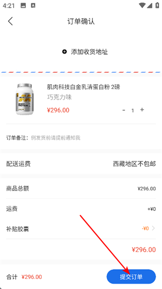 4、在订单确认页面,添加收货地址后,点击提交订单,完成订单提交。