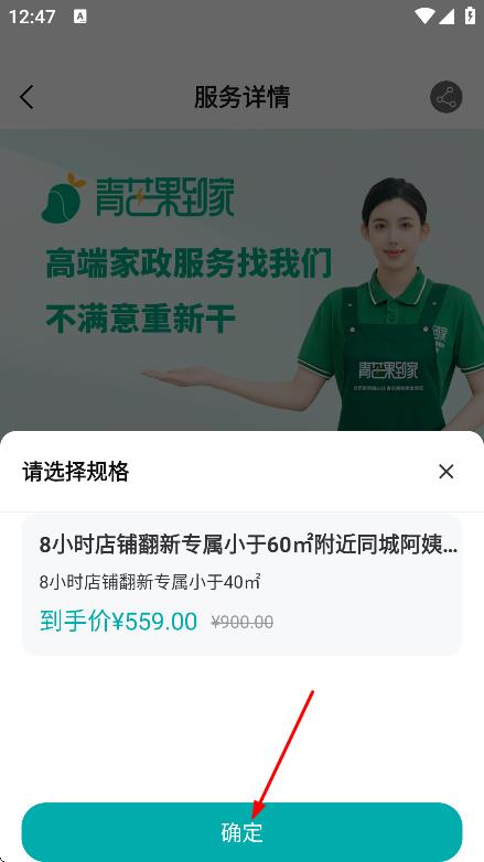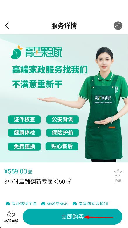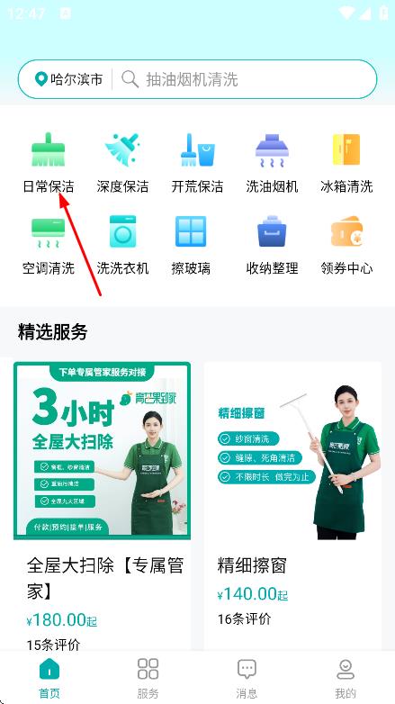 1、在首页,点击日常保洁,进入服务详情页面。