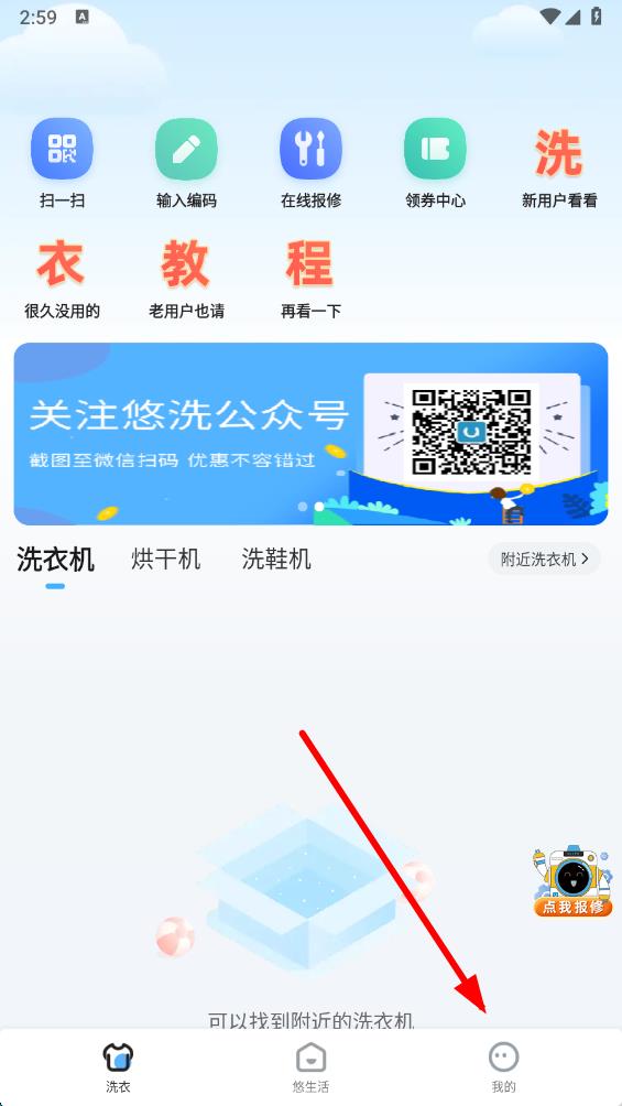 1、打开悠洗洗衣APP,点击底部导航栏中的我的选项,进入个人页面。