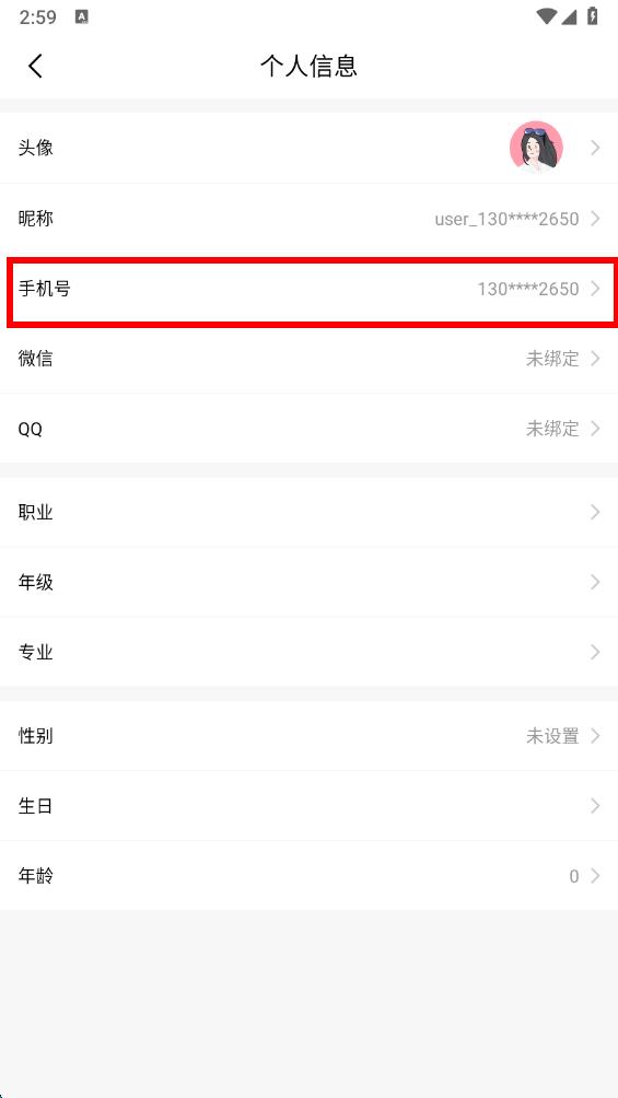 3、在个人信息界面里,找到并点击手机号选项,进入更改手机号页面。