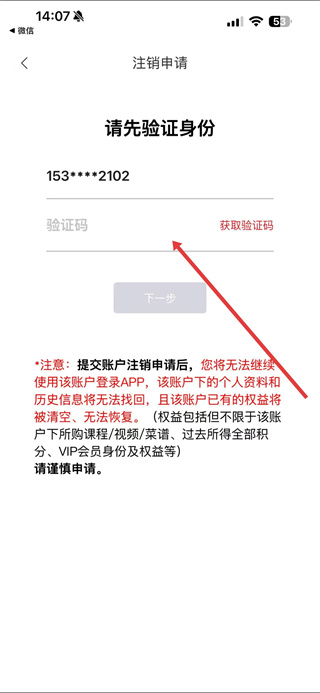 4、在注销申请页面,按提示完成身份验证,比如点击获取验证码并输入收到的验证码,按后续提示操作即可注销账号。