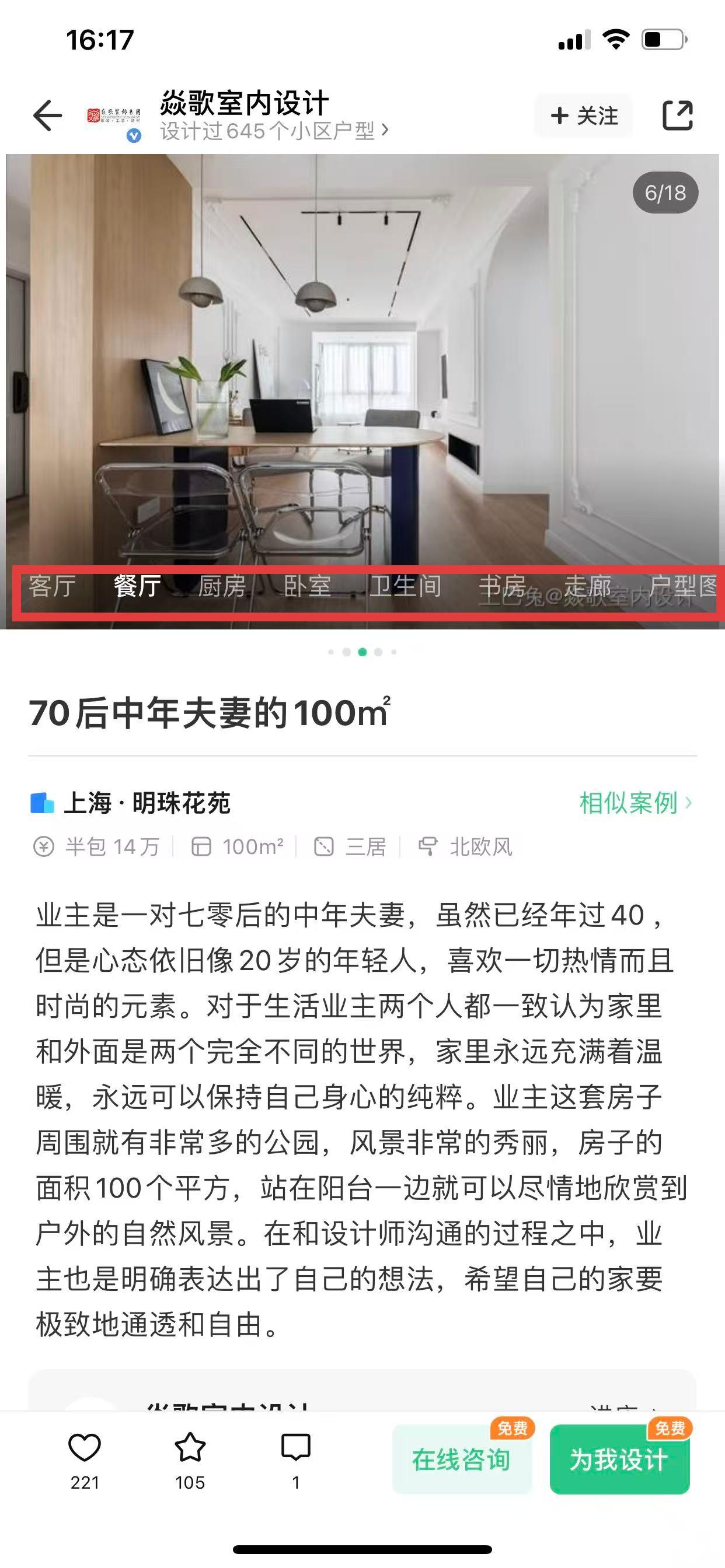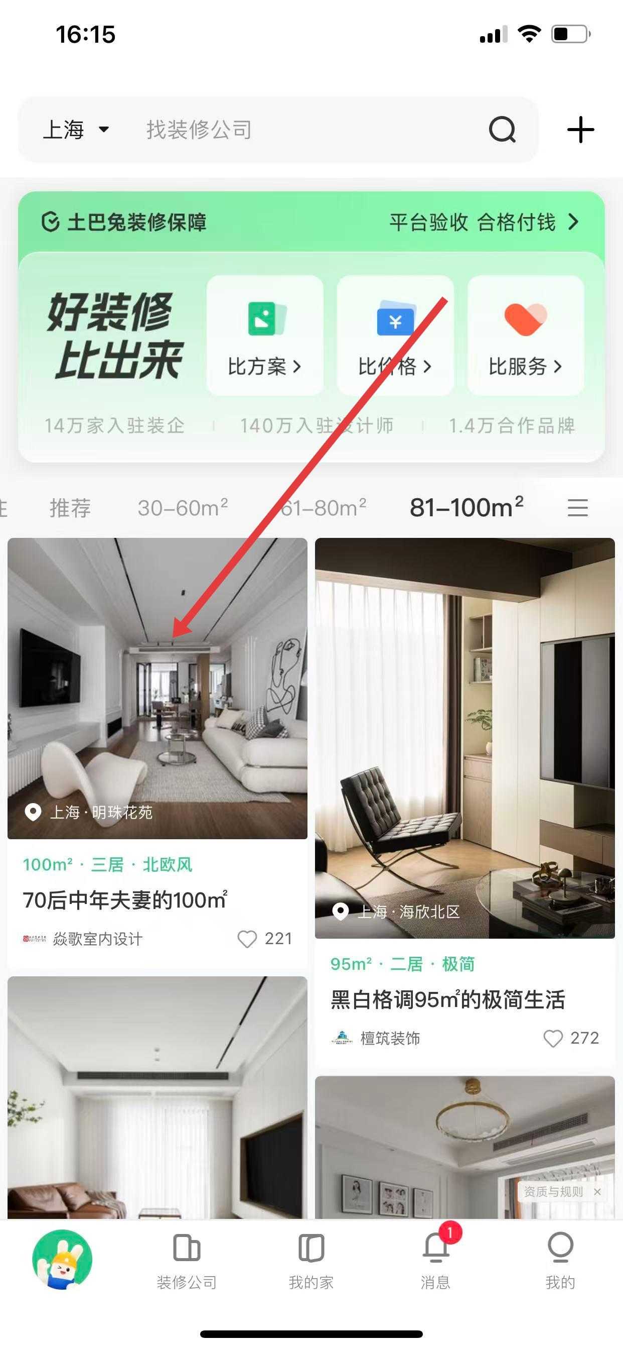 2、在推荐的装修案例列表里,找到感兴趣的案例图片,点击进入其详情页面。