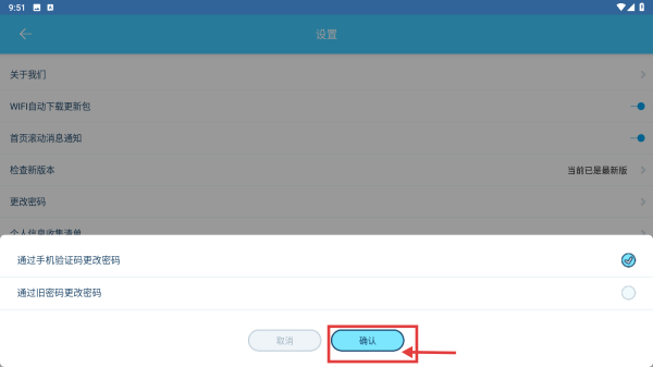 3、在设置页面,点击更改密码选项,选择密码更改方式如手机验证码方式。