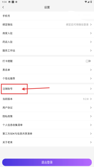 3、在设置页面,点击注销账号选项,进入账号注销确认页面。