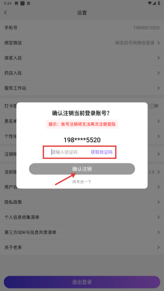 4、输入验证码,点击确认注销按钮,完成账号注销操作。