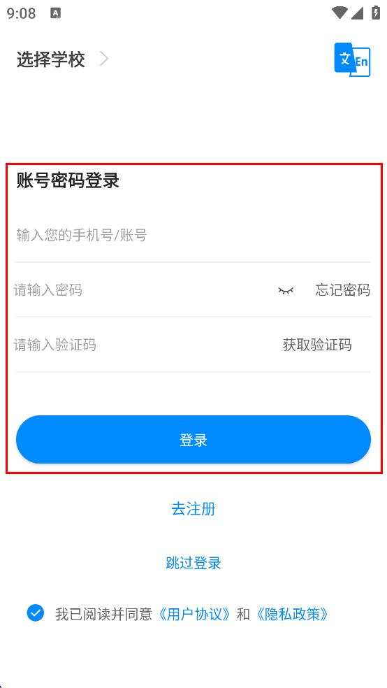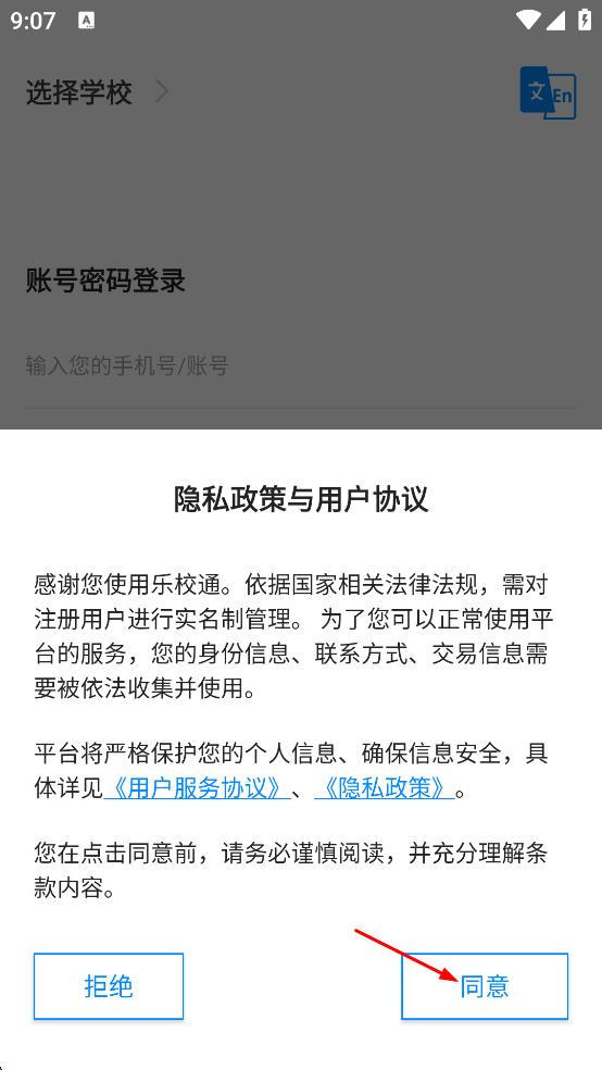 1、打开乐校通,在弹出的隐私政策与用户协议页面,点击同意,进入账号密码登录界面。