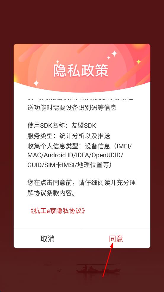 1、打开杭工e家,弹出隐私政策提示,点击同意,进入软件首页。