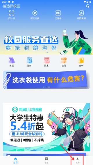 1、打开校园服务类应用,点击底部我的选项,进入个人中心页面。