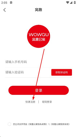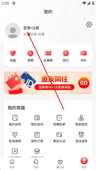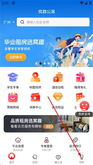 1、打开窝趣公寓,点击底部导航栏最右侧的我的。