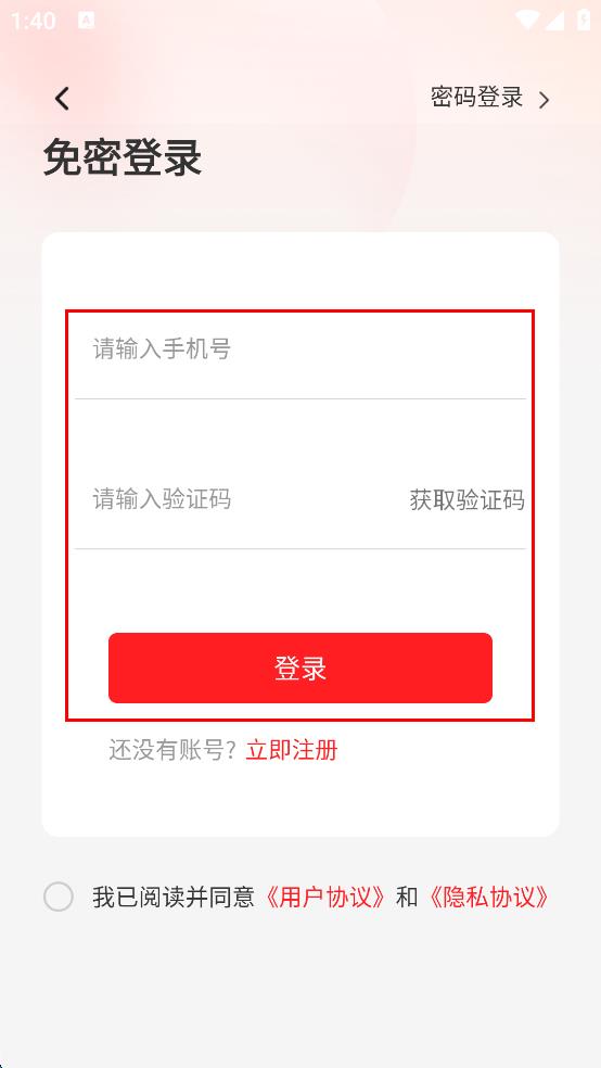 4、在免密登录界面输入手机号,点击获取验证码,输入验证码,勾选已阅读并同意相关协议后点击登录,完成登录操作。
