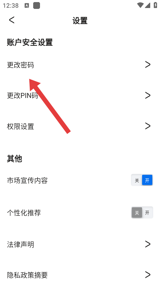 2、在设置页面中,点击更改密码的选项,进入身份验证的环节。