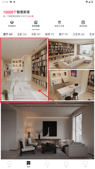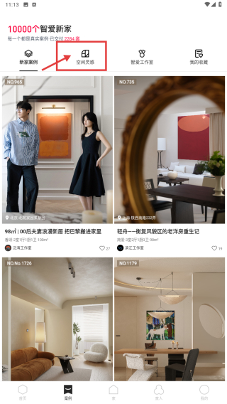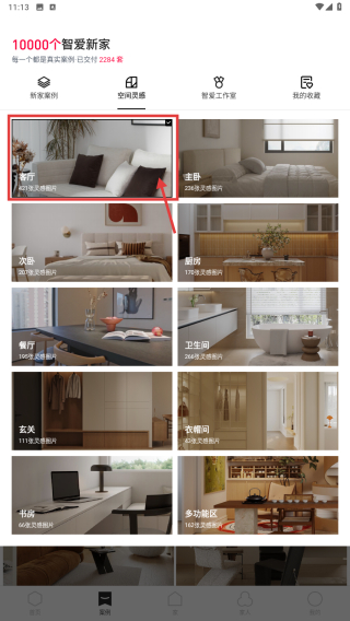 2、在案例页面,点击空间灵感选项,查看不同空间的装修案例。