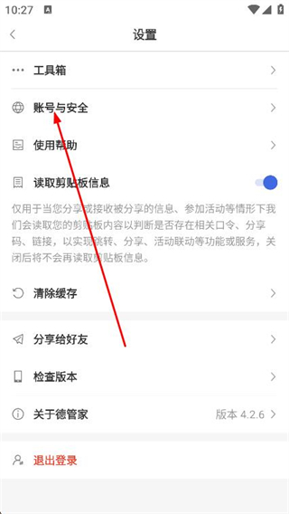 3、进入设置页面后,点击账号与安全选项。