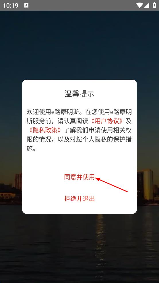 1、打开e路康明斯APP,在弹出的温馨提示框中,点击同意并使用。