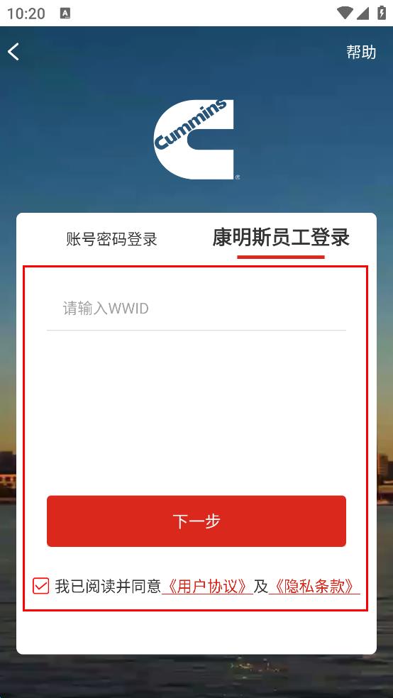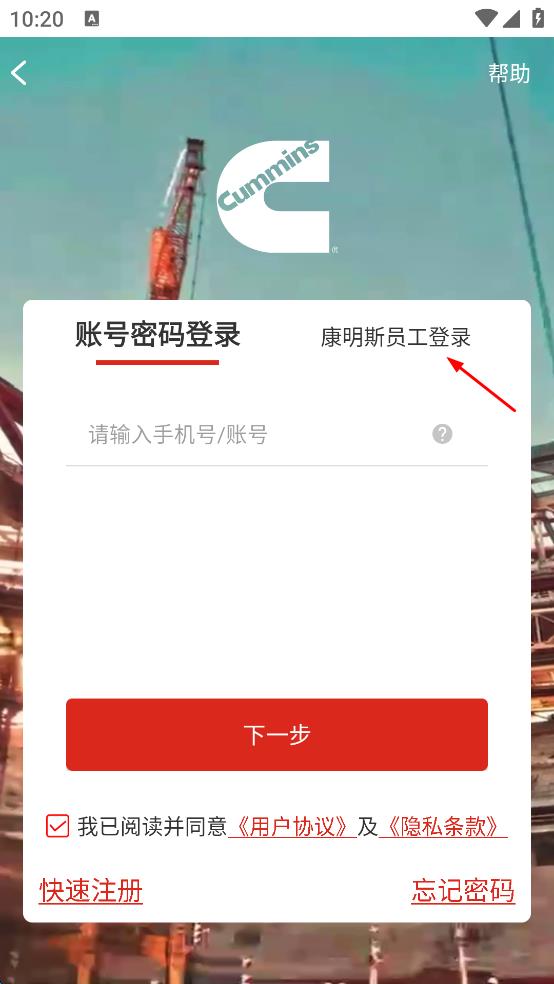 3、在账号密码登录页面,点击康明斯员工登录选项。