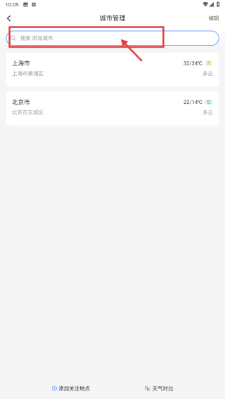 1、打开天气APP,点击左上角加号按钮,进入城市搜索页面。