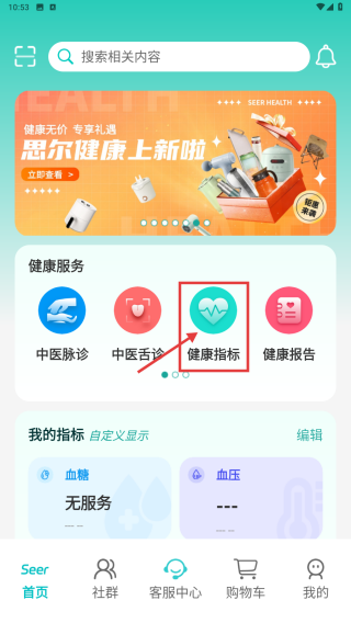 1、打开健康管理应用,点击首页的健康指标选项,进入健康指标页面。