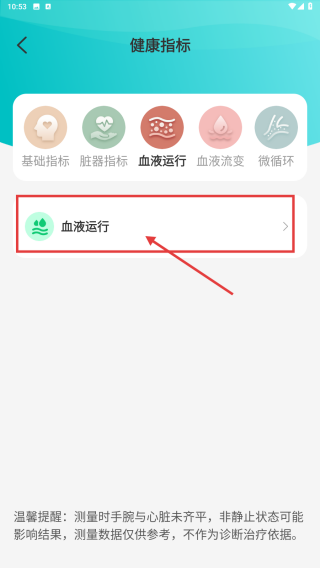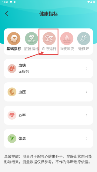 2、在健康指标页面,点击血液运行分类,查看血液运行相关指标。