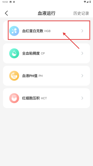 3、在血液运行指标列表中,找到血红蛋白克数HGB指标,点击进入详情页。