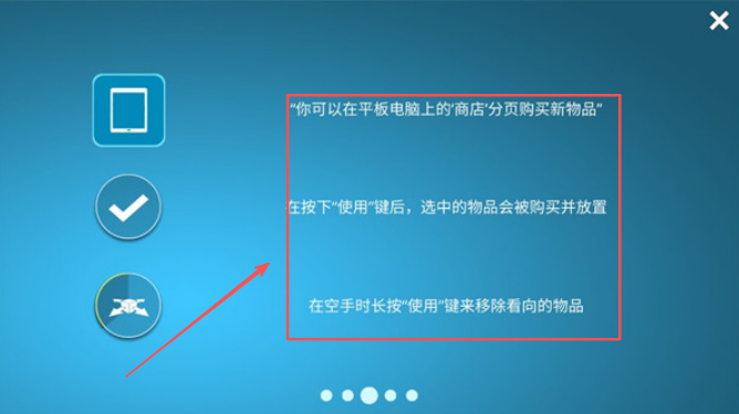 1、在平板商店购买新物品,点击使用键完成购买和放置,空手时长按可移除物品。