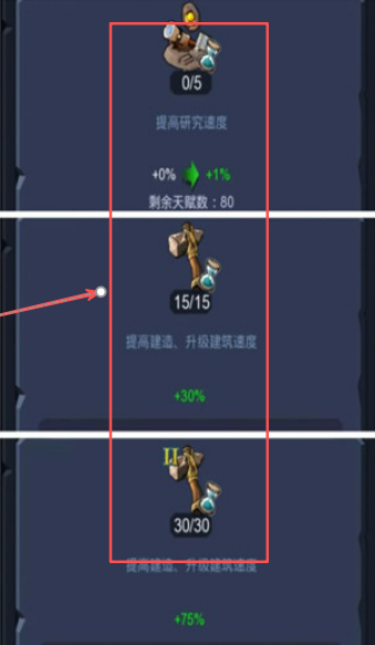 2、通过完成任务和升级建筑提升角色等级,获得天赋点数用于缩短建造时间。