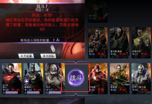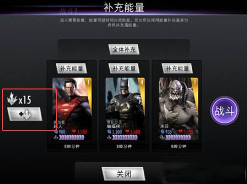 6、如果想爽,需要充能,游戏初期会提供15个,然后通关一个战役会附送一些,前期大家可以慢慢攒,到了第六大关开始大致能攒到几十个,那时就可以配出2超人+1蝙蝠侠的队形,就充能前进吧,不然实在有难度。