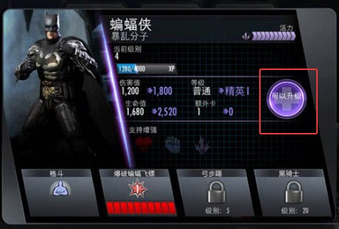 7、不义联盟人间之神手机版后期有1关是40级的5级精英蝙蝠侠敌人,拥有15W生命,2W多攻击,如果你没有3个超级大招基本玩不过去,好在本站提供的游戏已经实现了无限金币,过关那就是分分钟搞定的事情。