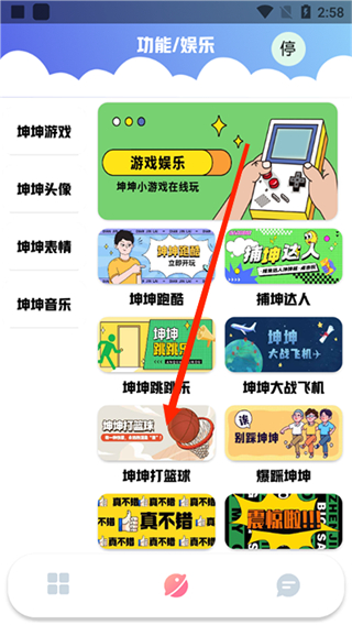 2、在游戏列表中选择坤坤打篮球项目内容,该程序包含多种趣味小游戏类型。