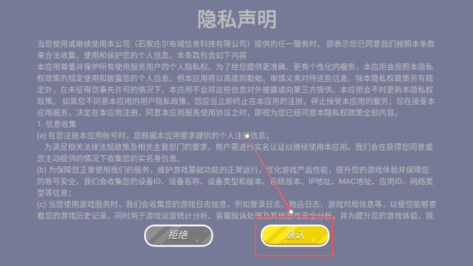 1、打开王牌求生大作战后,首先会弹出游戏协议页面,在页面中找到同意选项并点击,完成协议确认后才能进入后续界面。