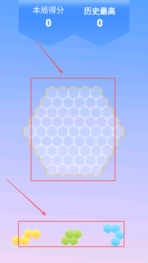 3、然后尝试用六边形方块组合出更多不同玩法,遇到思路卡顿时,多开动脑筋想办法,慢慢找到高效消除的技巧。