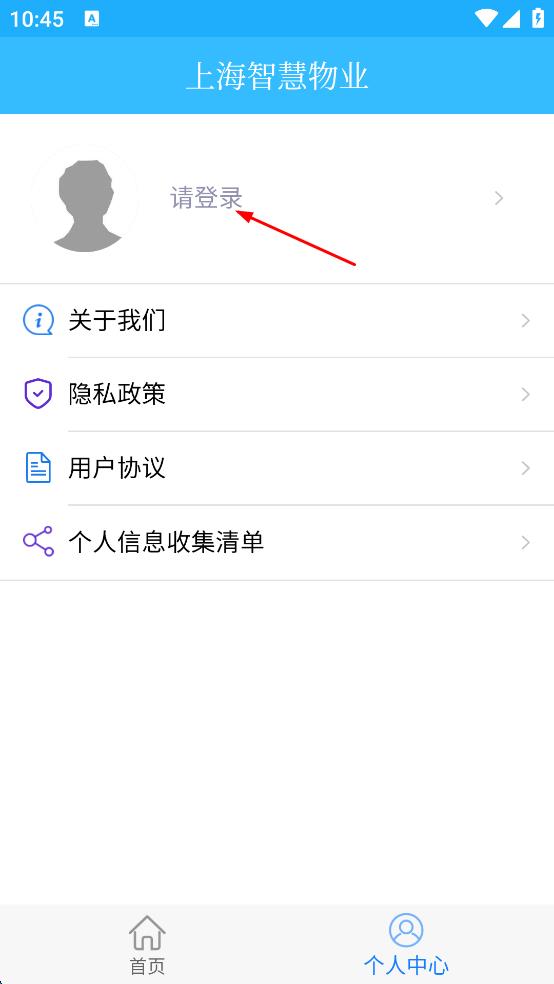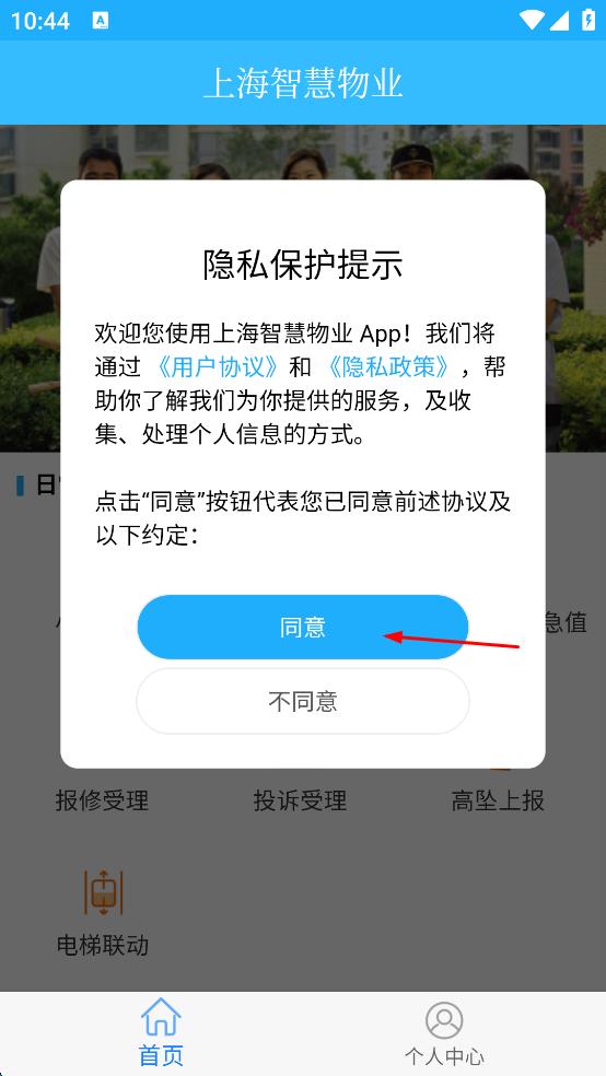 1、打开上海智慧物业App,在弹出的隐私保护提示弹窗中,点击同意按钮,进入首页。