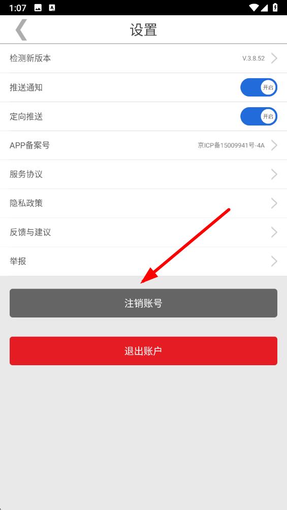 3、在设置界面中,向下滑动找到注销账号按钮,点击进入注销账号确认页面。
